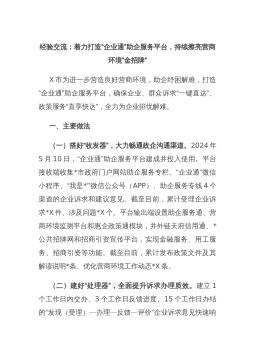 经验交流:着力打造“企业通”助企服务平台,持续擦亮营商环境“金招牌”X市为进一步营造良好营商环境,助企纾困解难,打造“企业通”助企服务平台,确保企业、群众诉求“一键直达”、政策服务“直享快达”,全力为企业排忧解难。一、主要做法(一)搭好“收发器”,大力畅通政企沟通渠道。2024年5月10日,“企业通”助企服务平台建成并投入使用。平台接收端收集*市政府门户网站助企服务专栏、“企业通”微信小程序、“我是*”微信公众号(APP)、助企服务专线4个渠道的企业诉求和建议意见。截至目前,累计受理企业诉求*X件、涉及问题*X个。平台输出端设置助企服务通、营商环境监测平台和惠企政策通模块,并外链天府信用通、*...