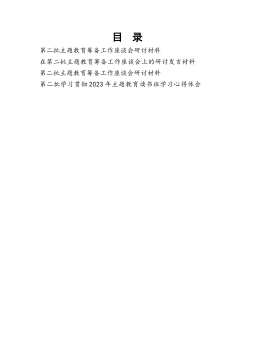 目录第二批主题教育筹备工作座谈会研讨材料在第二批主题教育筹备工作座谈会上的研讨发言材料第二批主题教育筹备工作座谈会研讨材料第二批学习贯彻2023年主题教育读书班学习心得体会第二批主题教育筹备工作座谈会研讨材料从今年4月开始,全党自上而下分两批开展学习贯彻习近平新时代中国特色社会主义思想主题教育。目前,第一批主题教育已接近"尾声",第二批主题即将拉开序幕接棒“登场”。基层党员干部要杜绝"等靠要”,把握贯彻学习“总要求",在总结好第一批主题教育经验的基础上,迅速行动,提前准备,为第二批主题教育“预热升温”,确保取得实实在在的成效。学用贯通、笃信笃行,在“身入心至、善思善用”中让理论武装更进一“步”...