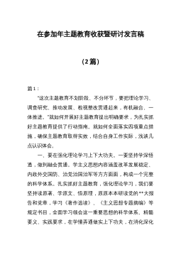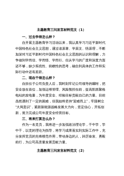 主题教育三问发言材料范文(1)一、过去学得怎么样?自开展主题教育学习活动以来,我认真学习习近平新时代中国特色社会主义思想,通过读原著、学原文、悟原理,不断加深对习近平新时代中国特色社会主义思想的认识和理解,力争做到学而信、学而悟、学而行。但从学习的广度和深度方面还不够,缺少系统性、前瞻性的思考,融合到具体的工作和实际行动中还有差距。二、现在干得怎么样?自担任子公司负责人后,我时刻牢记公司领导的嘱咐,把安全放在首位,加强运维管理、风险预控在前,提高阳原聚格电站的发电量,为年度安全、经验目标贡献自己的力量。目前虽然遇到了一定的困难,但我始终坚持“迎难而上”,牢固树立“大局意识”,紧跟新能源战略发展...