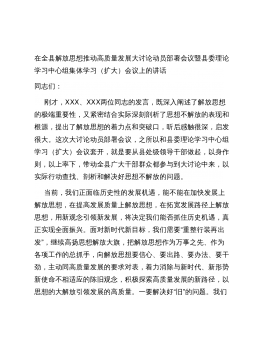 在全县解放思想推动高质量发展大讨论动员部署会议暨县委理论学习中心组集体学习(扩大)会议上的讲话同志们:刚才,XXX、XXX两位同志的发言,既深入阐述了解放思想的极端重要性,又紧密结合实际深刻剖析了思想不解放的表现和根源,提出了解放思想的着力点和突破口,听后感触很深,启发很大。这次大讨论动员部署会议,之所以和县委理论学习中心组学习(扩大)会议套开,就是要从县处级领导干部做起,以身作则,以上率下,带动全县广大干部群众都参与到大讨论中来,以实际行动查找、剖析和解决好思想不解放的问题。当前,我们正面临历史性的发展机遇,能不能在加快发展上解放思想,在提高发展质量上解放思想,在拓宽发展路径上解放思想,用新...