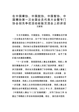 在中国聋协、中国肢协、中国智协、中国精协第一次全国会员代表大会暨专门协会创先争优活动经验交流会上的讲话王新宪今天中国聋协、中国肢协、中国智协、中国精协召开第一次全国会员代表大会,五个专门协会分别召开委员会会议,通报表扬协会工作优秀单位和个人,交流专门协会创先争优活动经验;同时举办全国省级残联组联干部培训班。刚才海迪主席宣读了朴方同志的贺信。朴方同志对专门协会工作作出的重要指示是对残疾人的深情厚爱和亲切关怀,给予了我们极大的激励和鞭策。“十一五”时期,是我国残疾人事业发展最快、残疾人得到实惠最多的五年,广大残疾人实现了很多梦想,得到了多方面保障,同时也为国家赢得了许多荣誉。残疾人康复工作扎实推进...