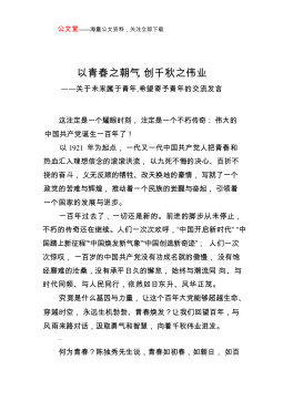 公文堂——海量公文资料,关注立即下载以青春之朝气创千秋之伟业——关于未来属于青年,希望寄予青年的交流发言这注定是一个耀眼时刻,注定是一个不朽传奇:伟大的中国共产党诞生一百年了!以1921年为起点,一代又一代中国共产党人把青春和热血汇入理想信念的滚滚洪流,以九死不悔的决心、百折不挠的奋斗,义无反顾的牺牲、改天换地的豪情,写就了一个政党的苦难与辉煌,推动着一个民族的觉醒与奋起,引领着一个国家的发展与进步。一百年过去了,一切还是新的。前进的脚步从未停止,不朽的传奇还在继续。人们一次次欢呼,“中国开启新时代”“中国踏上新征程”“中国焕发新气象”“中国创造新奇迹”;人们一次次惊叹,一百岁的中国共产党没有...