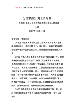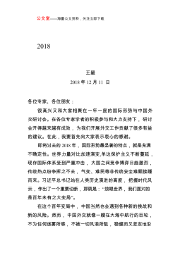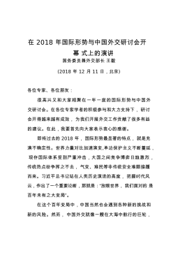 在2018年国际形势与中国外交研讨会开幕式上的演讲国务委员兼外交部长王毅(2018年12月11日,北京)各位专家、各位朋友:很高兴又和大家相聚在一年一度的国际形势与中国外交研讨会。在各位专家学者的积极参与和大力支持下,研讨会开得越来越有成效,为我们开展外交工作贡献了很多有益的建议。在此,我要首先向大家表示衷心的感谢。即将过去的2018年,国际形势最显著的特点,就是充满不确定性。世界力量对比加速演变,单边保护主义不断蔓延,现存国际体系受到严重冲击,大国之间竞争博弈日趋激烈,传统热点纷争挥之不去,气变、难民等非传统安全难题接踵而来。习近平总书记站在人类历史演进的高度,把握时代风云,作出了一个重要论...