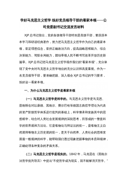 学好马克思主义哲学练好党员领导干部的看家本领——公司党委副书记交流发言材料XJP总书记指出,党的各级领导干部特别是高级干部,要原原本本学习和研读经典著作,努力把马克思主义哲学作为自己的看家本领,坚定理想信念,坚持正确政治方向,提高战略思维能力、综合决策能力、驾驭全局能力,团结带领人民不断书写改革开放历史新篇章。XJP总书记把马克思主义哲学视作我们的“看家本领”,充分体现了党中央对马克思主义哲学地位的充分认识和高度重视。作为一名党员领导干部,要准确把握、深入领会XJP总书记的学习要求,练好这一看家本领。一、为什么马克思主义哲学是看家本领(一)马克思主义哲学是科学的。马克思主义哲学是马克思、恩格斯...
