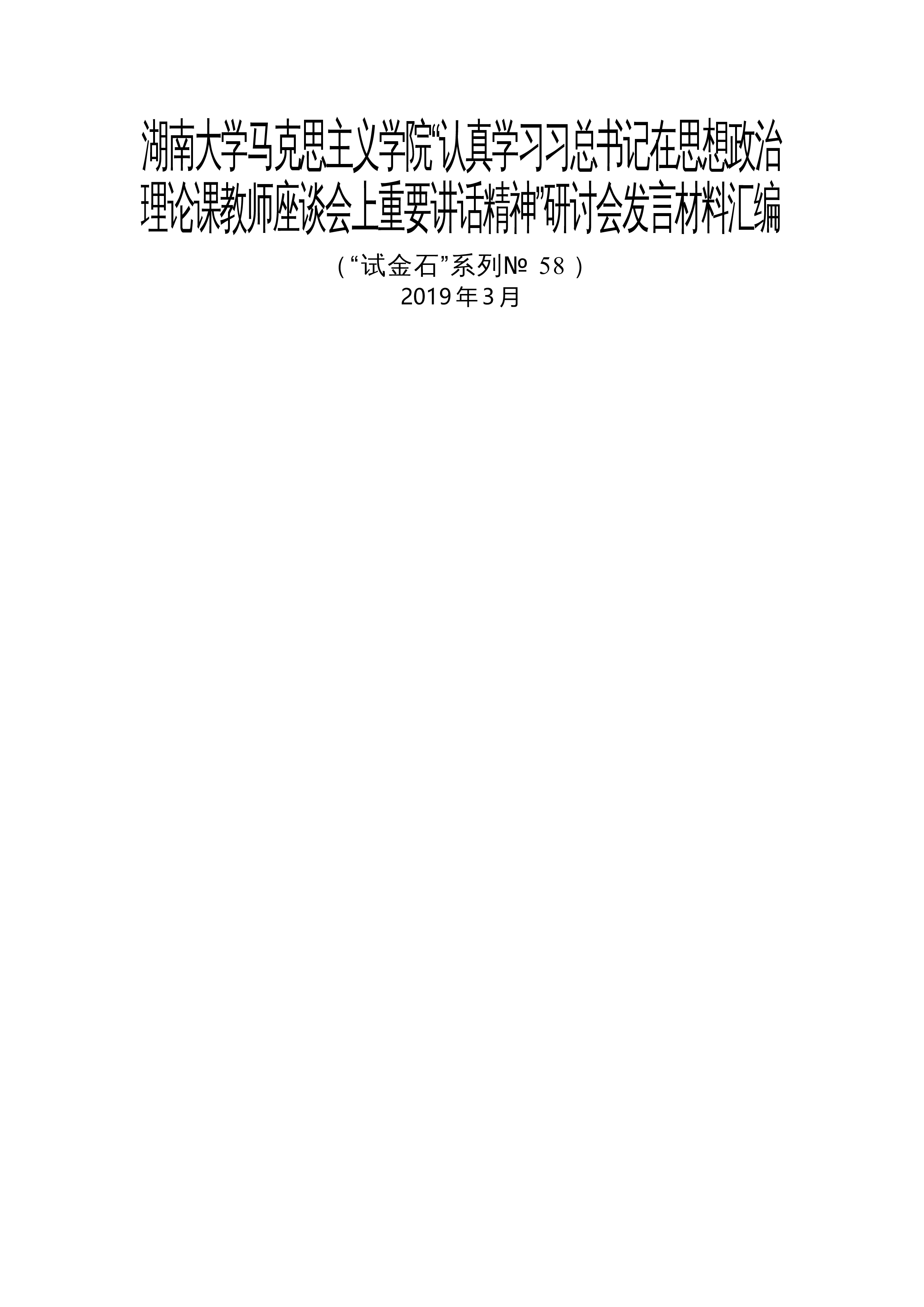 湖南大学马克思主义学院“认真学习习总书记在思想政治理论课教师座谈会上重要讲话精神”研讨会发言材料汇编(“试金石”系列№58)2019年3月目录1.侯德泉:“八个相统一”:新时代思政课改革创新的基本遵循...................12.孙宏云:努力做一名优秀的思政课教师......................................33.刘近:当前上好思政课的有利条件........................................54.邬彬:责任、危机、使命:一名思政课新兵学习体会........................75.刘晓玲:湖大马院办好思政...
