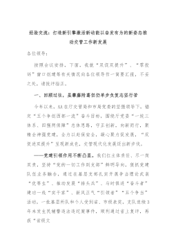 经验交流:打造新引擎激活新动能以奋发有为的新姿态推动交管工作新发展各位领导:按照会议安排,下面,我就“双促双提升”、“零投诉”窗口创建等有关情况向各位领导作一简要汇报,不妥之处,请批评指正。一、回顾过往,虽攀藤附葛但仍单步负笈志坚行苦今年以来,AA在厅交管局和市局党委的坚强领导下,锚定“五个争创西部一流”奋斗目标,围绕厅党委“一统三体系、四强两保障”总体思路,守正创新,向新而行,聚精会神强党建,全力以赴保安全,凝心聚力促发展,“双促进双提升”呈现新成色,交管现代化发展迈出新步伐。——党建引领作用不断凸显。我们扛主体责任、尽一岗双责,坚持“党的一切工作到支部”鲜明导向,狠抓党建队伍业务融合,通过...