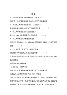 目录1.石景山区人大常委会党组书记、主任李xx:加强“四个机关”建设推动石景山区人大工作高质量发展……12.房山区人大常委会党组书记、主任刘xx:以首善标准推动新时代人大工作高质量发展……………23.市人大常委会农村办公室主任金xx:践行全过程人民民主提高节水立法质量……………34.市人大常委会代表联络室主任李xx:深入学习贯彻党的二十大精神,奋力谱写新时代首都人大代表工作新篇章……………45.市人大代表、北京工业大学教授李xx:用心用情书写全过程人民民主“北京答卷”……………5北京市深入学习贯彻习近平总书记关于坚持和完善人民代表大会制度的重要思想交流会发言材料汇编(北京日报,2023年1月)...
