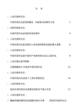目录1.人民日报评论员:中国式现代化是强国建设、民族复兴的康庄大道12.光明日报评论员:中国式现代化必须坚持党的领导43.人民日报评论员:中国式现代化是党领导人民长期探索和实践的重大成果64.人民日报评论员:中国式现代化是中国共产党领导的社会主义现代化95.人民日报记者邝西曦:正确理解和大力推进中国式现代化126.人民日报评论员:中国式现代化创造了人类文明新形态147.人民日报评论员:推进中国式现代化需要处理好若干重大关系178.人民日报评论员:9.推进中国式现代化必须进行伟大斗争20经济日报评论员:牢牢把握中国式现代化的根本性质2310.经济日报评论员:深刻理解中国式现代化的科学内涵2511...