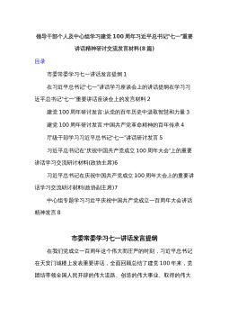 领导干部个人及中心组学习建党100周年习近平总书记“七一”重要讲话精神研讨交流发言材料(8篇)目录市委常委学习七一讲话发言提纲1在习近平总书记“七一”讲话学习座谈会上的讲话提纲在学习习近平总书记“七一”重要讲话座谈会上的发言材料2建党100周年研讨发言:从党的百年历史中汲取智慧和力量3建党100周年研讨发言:中国共产党革命精神的百年传承4厅级干部学习习近平总书记“七一”讲话研讨发言5习近平总书记在“庆祝中国共产党成立100周年大会”上的重要讲话学习交流研讨材料(政协主席)6习近平总书记在庆祝中国共产党成立100周年大会上的重要讲话学习交流研讨材料(政协副主席)7中心组专题学习习近平庆祝中国共产...