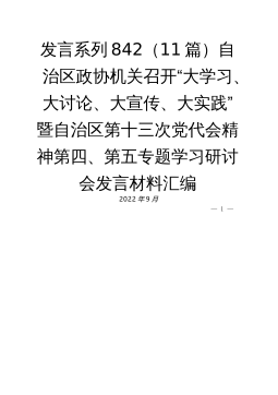 (11篇)自治区政协机关召开“大学习、大讨论、大宣传、大实践”暨自治区第十三次党代会精神第四、第五专题学习研讨会发言材料汇编