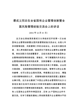 谭成义同志在全省国有企业管理创新暨全面风险管理经验交流会上的讲话(2011年12月15日)这次会议是省国资委成立以来组织召开的第一次全省国有企业管理创新暨全面风险管理经验交流会议,也是七年多来管理创新、风险管理工作的总结会议。会议的主要任务是,深入贯彻落实省委、省政府关于国有企业要带头创新管理、转变发展方式的部署要求,总结交流近年来全省国有企业管理创新取得的新经验、新做法,学习掌握国内外先进企业管理创新的理论和实践成果,安排部署进一步加强企业管理创新、推动发展方式转变的目标任务和工作措施。企业的兴衰成败,说到底都是因管理而引起的。管理可以把企业推向巅峰,也可以把企业推向深渊。希望通过这次会议,...