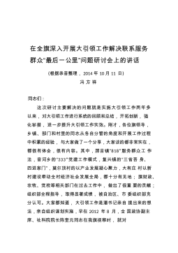 在全旗深入开展大引领工作解决联系服务群众“最后一公里”问题研讨会上的讲话(根据录音整理,2014年10月11日)冯方祥同志们:这次研讨主要解决的问题就是实施大引领工作两年多以来,对大引领工作进行系统的回顾和总结,开拓创新,强化举措,进一步提升大引领工作实效。刚才,各位旗领导,乡镇、部门和村里的同志从各自分管的角度和开展工作过程中积累的经验,与大家做了一个分享,大家谈的都非常实在,都很有体会,很有内容。其中,那吉镇“818”服务群众工作法,音河乡的“333”党建工作模式,复兴镇的“三省吾身、四进家门”,莫尔顶村的以产业发展凝心聚力,大有庄村以新村建设牵动全村经济社会发展全局,都十分有见地;旗财政...