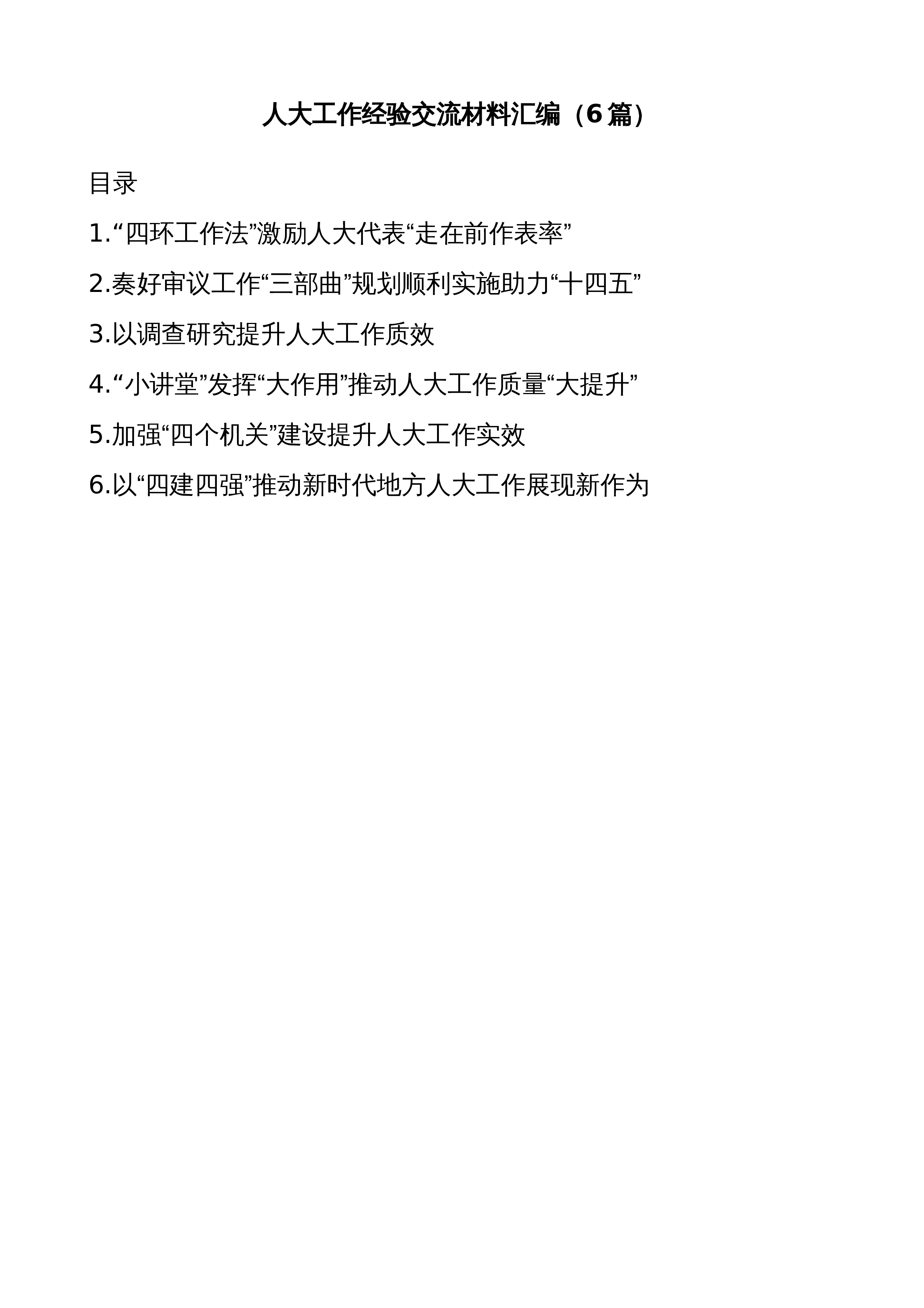 人大工作经验交流材料汇编(6篇)目录1.“四环工作法”激励人大代表“走在前作表率”2.奏好审议工作“三部曲”规划顺利实施助力“十四五”3.以调查研究提升人大工作质效4.“小讲堂”发挥“大作用”推动人大工作质量“大提升”5.加强“四个机关”建设提升人大工作实效6.以“四建四强”推动新时代地方人大工作展现新作为“四环工作法”激励人大代表“走在前作表率”党的二十大报告强调,“加强人民当家作主制度保障”“加强人大代表工作能力建设,密切人大代表同人民群众的联系”。今年以来,xx省xx市人大常委会坚持以习近平新时代中国特色社会主义思想为指导,深入学习贯彻党的二十大精神,认真落实中央和省委人大工作会议精神,...
