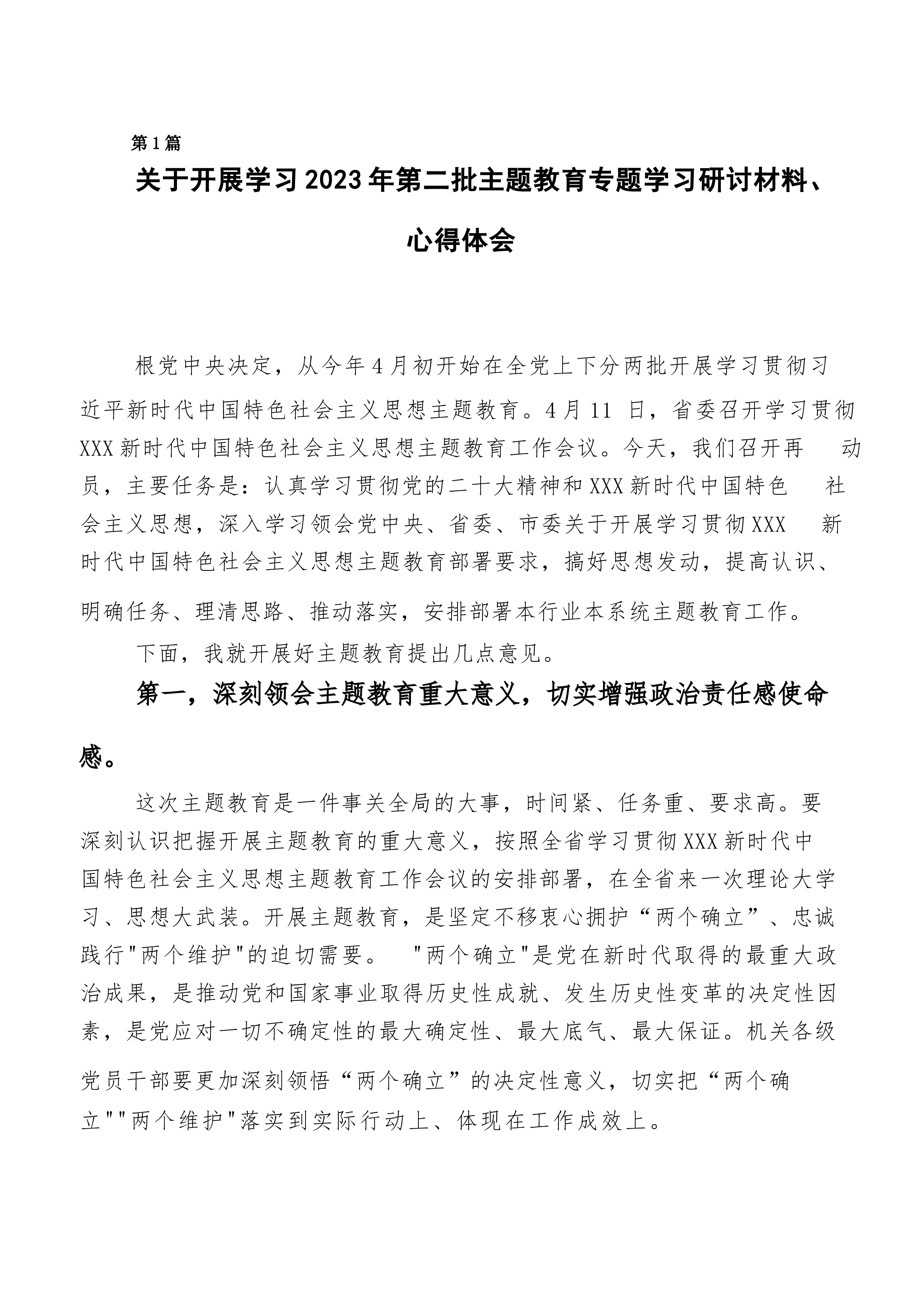 第1篇关于开展学习2023年第二批主题教育专题学习研讨材料、心得体会根党中央决定,从今年4月初开始在全党上下分两批开展学习贯彻习近平新时代中国特色社会主义思想主题教育。4月11日,省委召开学习贯彻XXX新时代中国特色社会主义思想主题教育工作会议。今天,我们召开再动员,主要任务是:认真学习贯彻党的二十大精神和XXX新时代中国特色社会主义思想,深入学习领会党中央、省委、市委关于开展学习贯彻XXX新时代中国特色社会主义思想主题教育部署要求,搞好思想发动,提高认识、明确任务、理清思路、推动落实,安排部署本行业本系统主题教育工作。下面,我就开展好主题教育提出几点意见。第一,深刻领会主题教育重大意义,切实...
