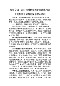 经验交流:走好新时代党的群众路线为企业高质量发展奠定深厚群众基础近年来,X深刻理解新时代党的群众路线的丰富内涵、核心要义和实践要求,坚持正确地认识群众,正确地看待群众,为企业高质量发展奠定了深厚的群众基础。一、情系于民,用真情实感,团结职工、温暖群众领导班子成立以来,坚持落细落小、多办实事好事,在确保企业健康长远发展的基础上,着力解决职工急难愁盼问题,不断提高职工权益保障水平,用真情实感团结起广大职工,践行了党一切依靠人民群众、一切为了人民群众的宗旨意识。全力维护职工合理合法权益。不折不扣落实企业年金、健康体检、教育培训、补充医疗等福利待遇,先后投入240多万元用于“春节慰问、夏送清凉、金秋助...