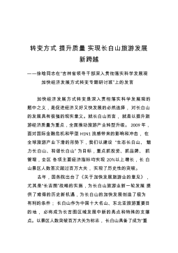 转变方式提升质量实现长白山旅游发展新跨越——徐晗同志在“吉林省领导干部深入贯彻落实科学发展观加快经济发展方式转变专题研讨班”上的发言加快经济发展方式转变是深入贯彻落实科学发展观的题中之义,是促进经济又好又快发展的必然选择,对长白山的发展具有很强的现实意义。就长白山而言,就是以提升旅游经济质量为重点,全面推动旅游产业转型升级。2009年,面对国际金融危机和甲型H1N1流感带来的影响和冲击,在全球旅游产业下滑的形势下,我们以建设“生态长白山、魅力长白山、和谐长白山”为目标,重点抓投资、抓品牌、抓管理,全区各项主要经济指标均实现20%以上增长,长白山景区人数首次超过百万大关,实现了历史性的突破。去年...
