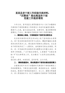某某县老干部工作经验交流材料:“四聚焦”推动离退休干部党建工作提质增效今年以来,某市某县认真贯彻落实中办《关于加强新时代离退休干部党的建设工作的意见》和省市实施意见精神,聚焦中心大局,着力在政治引领、发挥作用、服务管理和制度建设上下功夫,推动新时代离退休干部工作提质增效。一、聚焦凝心铸魂,引领离退休干部听党话跟党走先后组织离退休老同志参加线上线下宣讲报告会某场次,某个党支部共组织党员学习会某次,覆盖和辐射全县离退休老党员某多人次。通过组织开展相关主题活动,在全县老干部系统形成了一心跟党走、奋进新时代的生动局面。同时,进一步完善老同志按规定参加重要会议和重大活动、参观学习等制度,广泛开展走访慰问...