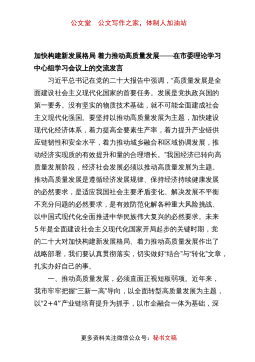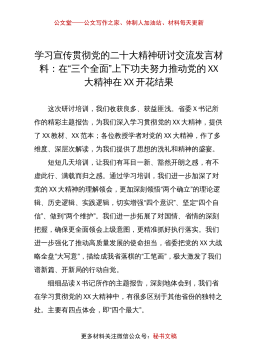 公文堂——公文写作之家、体制人加油站、材料每天更新学习宣传贯彻党的二十大精神研讨交流发言材料:深入贯彻党的XX大精神加快建设全省高质量发展的重要增长极省委XX届X次全会一结束,省委就紧接着举办省管干部学习贯彻党的XX大精神研讨班,以“全会研讨班”的方式,系统谋划贯彻落实XX大精神的“XX方案”,充分体现了推进中国式现代化的“XX担当”。通过五天专题式辅导、沉浸式学习、集中式研讨,静下心来读原著、悟原理,我感到政治上深受教育、思想上深受触动。特别是听了省委X书记在开班式上的讲话,让我们对党的XX大精神有了更深刻的理解,对奋力谱写“XX篇章”也有了更坚定的信心。这里,和大家交流三个方面心得体会:一...