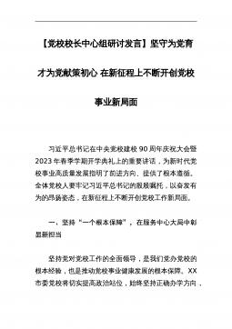 【党校校长中心组研讨发言】坚守为党育才为党献策初心在新征程上不断开创党校事业新局面习近平总书记在中央党校建校90周年庆祝大会暨2023年春季学期开学典礼上的重要讲话,为新时代党校事业高质量发展指明了前进方向、提供了根本遵循。全体党校人要牢记习近平总书记的殷殷嘱托,以奋发有为的昂扬姿态,在新征程上不断开创党校工作新局面。一、坚持“一个根本保障”,在服务中心大局中彰显新担当坚持党对党校工作的全面领导,是我们党办党校的根本经验,也是推动党校事业健康发展的根本保障。XX市委党校将切实提高政治站位,始终坚持正确办学方向,紧跟中央和省委、市委决策部署,做到中央和省委、市委要求什么,党校就坚定干什么;自觉服...