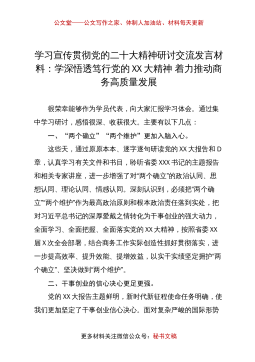 公文堂——公文写作之家、体制人加油站、材料每天更新学习宣传贯彻党的二十大精神研讨交流发言材料:学深悟透笃行党的XX大精神着力推动商务高质量发展很荣幸能够作为学员代表,向大家汇报学习体会。通过集中学习研讨,感悟很深、收获很大。主要有以下几点:一、“两个确立”“两个维护”更加入脑入心。这些天,通过原原本本、逐字逐句研读党的XX大报告和D章,认真学习有关文件和书目,聆听省委XXX书记的主题报告和相关专家讲座,进一步增强了对“两个确立”的政治认同、思想认同、理论认同、情感认同。深刻认识到,必须把“两个确立”“两个维护”作为最高政治原则和根本政治责任落到实处,把对习近平总书记的深厚爱戴之情转化为干事创业...