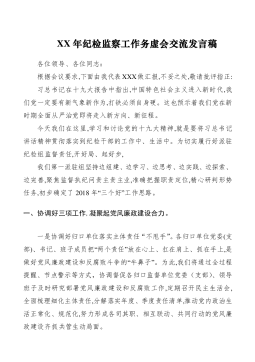 XX年纪检监察工作务虚会交流发言稿各位领导、各位同志:根据会议要求,下面由我代表XXX做汇报,不妥之处,敬请批评指正:习总书记在十九大报告中指出,中国特色社会主义进入新时代,我们党一定要有新气象新作为,打铁必须自身硬。这也预示着我们党在新时期全面从严治党即将走入新方向、新征程。今天我们在这里,学习和讨论党的十九大精神,就是要将习总书记讲话精神贯彻落实到纪检干部的工作中、生活中。为切实履行好派驻纪检组监督责任,开好局、起好步,我们第一派驻组坚持边组建、边学习、边思考、边实践、边探索、边完善,聚焦监督执纪问责主责主业,准确把握职责定位,精心研判形势任务,初步确定了2018年“三个好”工作思路。一、...