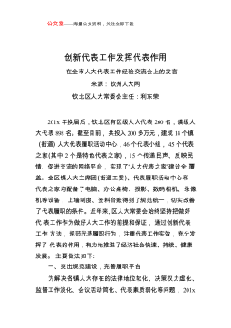 公文堂——海量公文资料,关注立即下载创新代表工作发挥代表作用——在全市人大代表工作经验交流会上的发言来源:钦州人大网钦北区人大常委会主任:利东荣201x年换届后,钦北区有区级人大代表260名,镇级人大代表898名。截至目前,共投入200多万元,建成14个镇(街道)人大代表履职活动中心,46个代表小组,45个代表之家(其中2个是特色代表之家),15个传递民声、反映民情、促进交流的网络平台,实现了“人大代表之家”建设全覆盖。全区镇人大主席团(街道工委)、代表履职活动中心和代表之家均配备了电脑、办公桌椅、投影、数码相机、录像机等设备,上墙制度、资料台账得到了规范统一,切实改善了代表履职的条件。近年来...