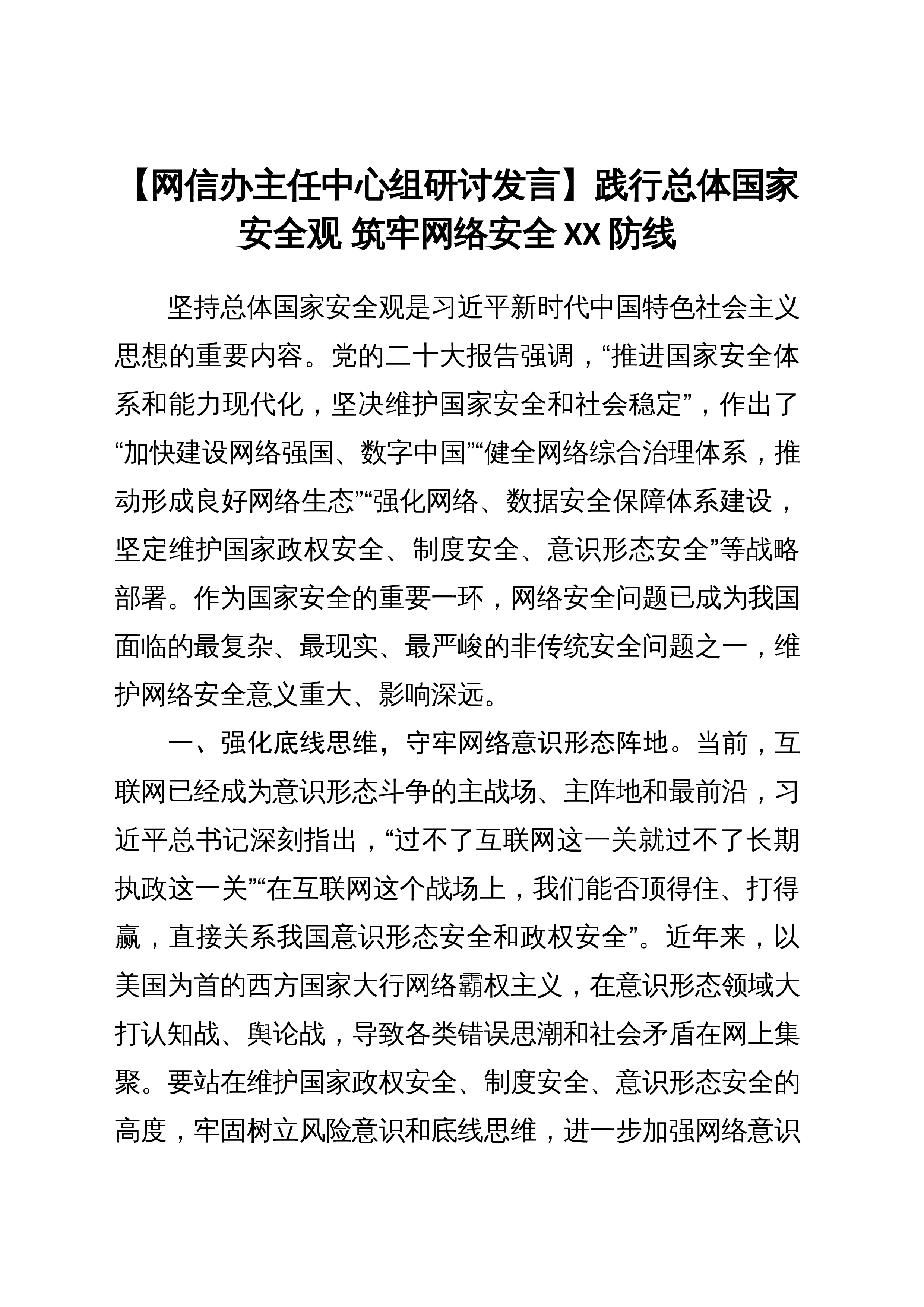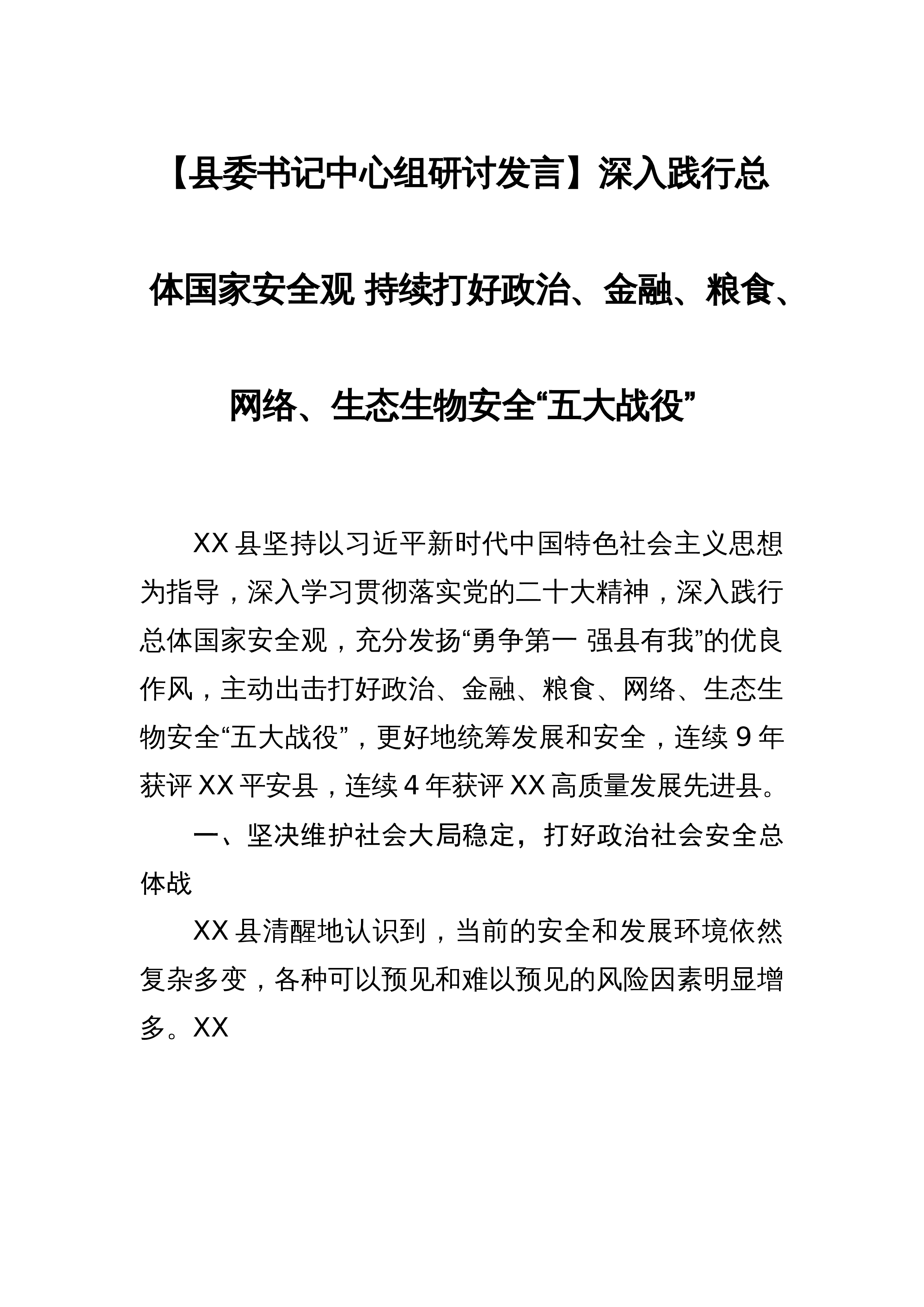 【县委书记中心组研讨发言】深入践行总体国家安全观持续打好政治、金融、粮食、网络、生态生物安全“五大战役”XX县坚持以习近平新时代中国特色社会主义思想为指导,深入学习贯彻落实党的二十大精神,深入践行总体国家安全观,充分发扬“勇争第一强县有我”的优良作风,主动出击打好政治、金融、粮食、网络、生态生物安全“五大战役”,更好地统筹发展和安全,连续9年获评XX平安县,连续4年获评XX高质量发展先进县。一、坚决维护社会大局稳定,打好政治社会安全总体战XX县清醒地认识到,当前的安全和发展环境依然复杂多变,各种可以预见和难以预见的风险因素明显增多。XX县始终坚持以人为本,坚持国家安全一切为了人民、一切依靠人民...