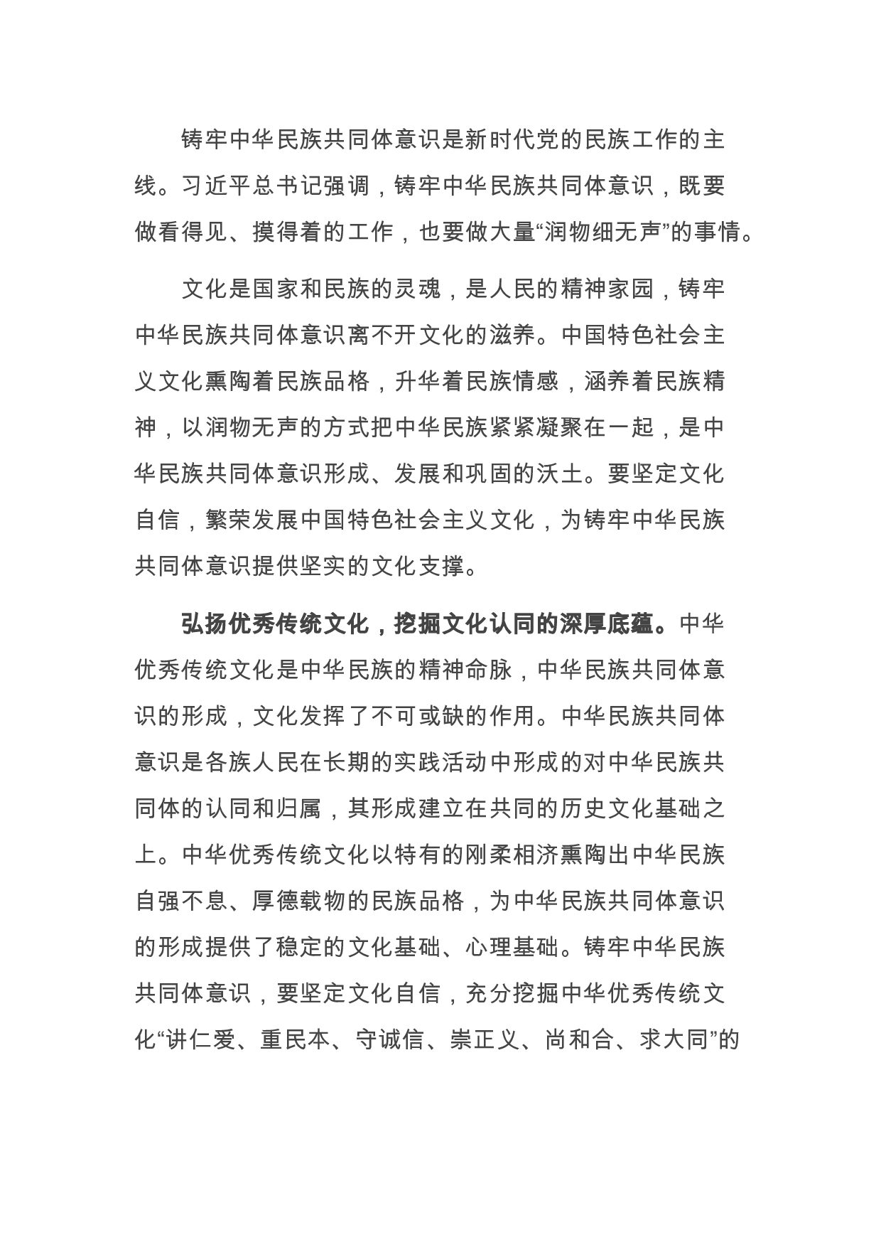 铸牢中华民族共同体意识是新时代党的民族工作的主线。习近平总书记强调,铸牢中华民族共同体意识,既要做看得见、摸得着的工作,也要做大量“润物细无声”的事情。文化是国家和民族的灵魂,是人民的精神家园,铸牢中华民族共同体意识离不开文化的滋养。中国特色社会主义文化熏陶着民族品格,升华着民族情感,涵养着民族精神,以润物无声的方式把中华民族紧紧凝聚在一起,是中华民族共同体意识形成、发展和巩固的沃土。要坚定文化自信,繁荣发展中国特色社会主义文化,为铸牢中华民族共同体意识提供坚实的文化支撑。弘扬优秀传统文化,挖掘文化认同的深厚底蕴。中华优秀传统文化是中华民族的精神命脉,中华民族共同体意识的形成,文化发挥了不可或...