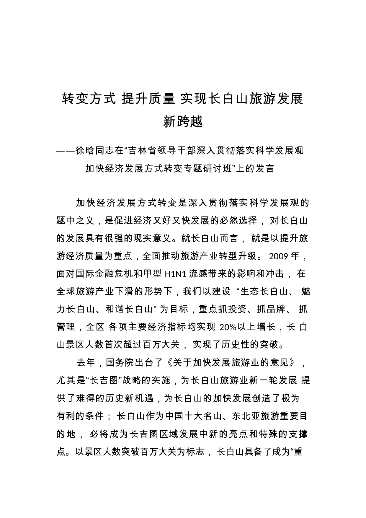 转变方式提升质量实现长白山旅游发展新跨越——徐晗同志在“吉林省领导干部深入贯彻落实科学发展观加快经济发展方式转变专题研讨班”上的发言加快经济发展方式转变是深入贯彻落实科学发展观的题中之义,是促进经济又好又快发展的必然选择,对长白山的发展具有很强的现实意义。就长白山而言,就是以提升旅游经济质量为重点,全面推动旅游产业转型升级。2009年,面对国际金融危机和甲型H1N1流感带来的影响和冲击,在全球旅游产业下滑的形势下,我们以建设“生态长白山、魅力长白山、和谐长白山”为目标,重点抓投资、抓品牌、抓管理,全区各项主要经济指标均实现20%以上增长,长白山景区人数首次超过百万大关,实现了历史性的突破。去年...