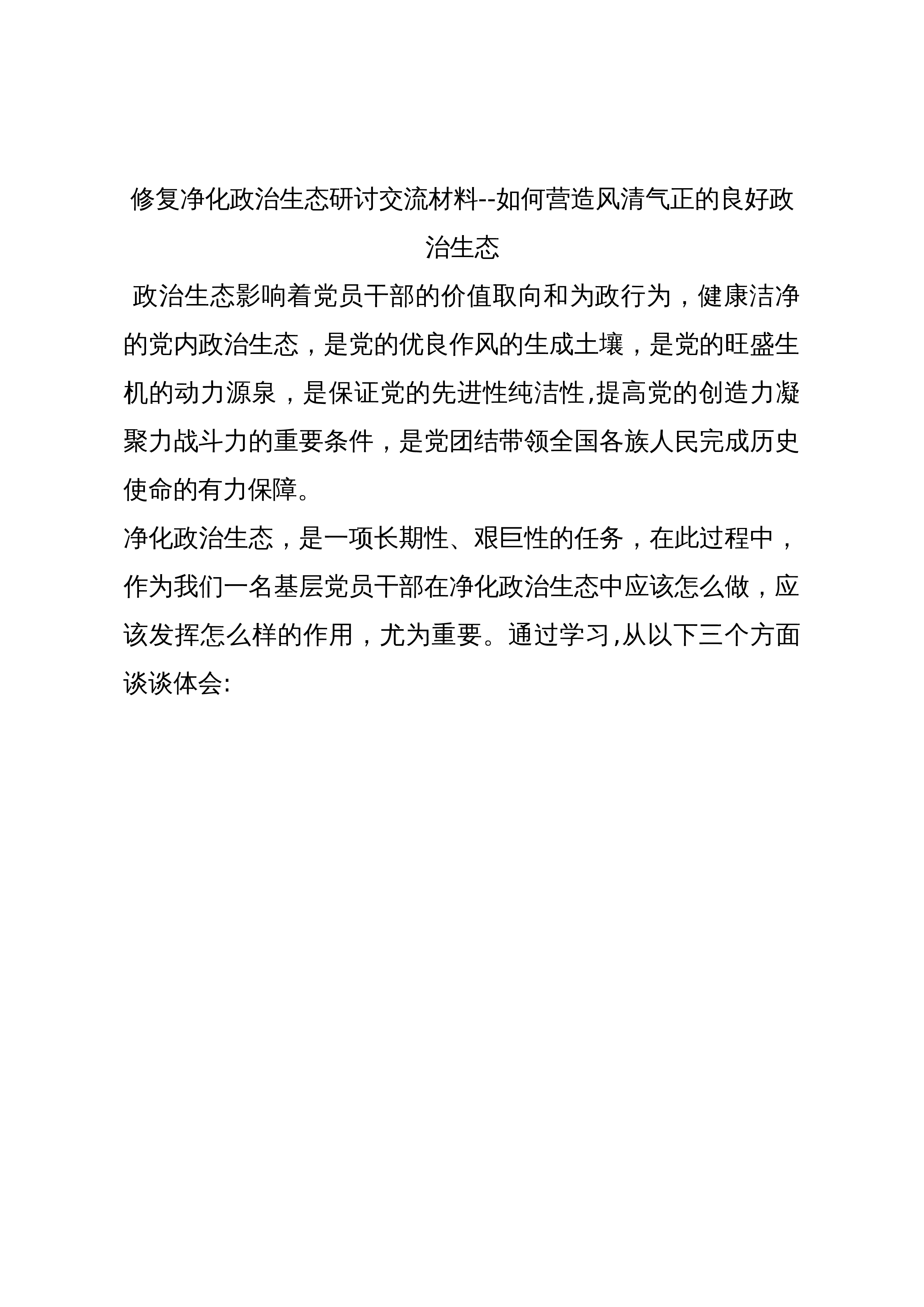 修复净化政治生态研讨交流材料--如何营造风清气正的良好政治生态政治生态影响着党员干部的价值取向和为政行为,健康洁净的党内政治生态,是党的优良作风的生成土壤,是党的旺盛生机的动力源泉,是保证党的先进性纯洁性,提高党的创造力凝聚力战斗力的重要条件,是党团结带领全国各族人民完成历史使命的有力保障。净化政治生态,是一项长期性、艰巨性的任务,在此过程中,作为我们一名基层党员干部在净化政治生态中应该怎么做,应该发挥怎么样的作用,尤为重要。通过学习,从以下三个方面谈谈体会:一、牢记宗旨,遵守纪律,争做合格党员。全面净化政治生态。首先,要提高政治站位,不断增强政治敏锐性,时刻提醒自己遵守政治纪律、政治规矩和组...