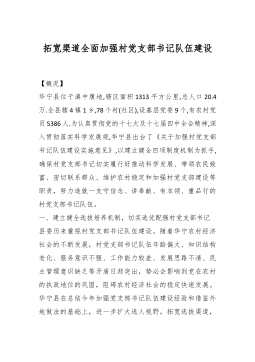 拓宽渠道全面加强村党支部书记队伍建设【概况】华宁县位于滇中腹地,辖区面积1313平方公里,总人口20.4万.全县辖4镇1乡,78个村(社区),设基层党委9个,有农村党员5386人.为认真贯彻党的十七大及十七届四中全会精神,深入贯彻落实科学发展观,华宁县出台了《关于加强村党支部书记队伍建设实施意见》,以建立健全四项制度机制为抓手,确保村党支部书记切实履行好推动科学发展、带领农民致富、密切联系群众、维护农村稳定和加强村党支部建设等职责,努力造就一支守信念、讲奉献、有本领、重品行的村党支部书记队伍。一、建立健全选拔培养机制,切实选优配强村党支部书记县委历来重视村党支部书记队伍建设。随着华宁农村经济社...