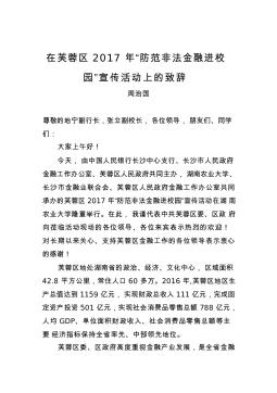 在芙蓉区2017年“防范非法金融进校园”宣传活动上的致辞周治国尊敬的地宁副行长,张立副校长,各位领导,朋友们、同学们:大家上午好!今天,由中国人民银行长沙中心支行、长沙市人民政府金融工作办公室、芙蓉区人民政府共同主办,湖南农业大学、长沙市金融业联合会、芙蓉区人民政府金融工作办公室共同承办的芙蓉区2017年“防范非法金融进校园”宣传活动在湖南农业大学隆重举行。在此,我谨代表中共芙蓉区委、区政府向莅临活动现场的各位领导、各位来宾表示热烈的欢迎!对长期以来关心、支持芙蓉区金融工作的各位领导表示衷心的感谢!芙蓉区地处湖南省的政治、经济、文化中心,区域面积42.8平方公里,常住人口60多万。2016年,...