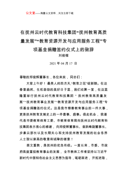 公文堂——海量公文资料,关注立即下载在抚州云时代教育科技集团“抚州教育高质量发展”“教育资源开发与应用服务工程”专项基金捐赠签约仪式上的致辞刘俊福2021年04月17日尊敬的郑俊辉董事长,各位来宾,同志们:大家上午好!最美人间四月天,“教育之花”绽新颜。在这春意盎然、生机勃勃的美好日子里,我们欢聚一堂,在这里隆重举行抚州云时代教育科技集团“抚州教育高质量发展”“抚州教育事业发展”“教育资源开发与应用服务工程”专项基金捐赠签约仪式。这是我市慈善教育事业的一件大事,更是抚州教育发展史上的一件喜事、盛事。借此机会,我谨代表市委教育体育工委、市教育体育局向抚州云时代教育科技集团表示衷心的感谢,向郑俊辉...