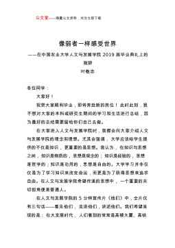 公文堂——海量公文资料,关注立即下载像弱者一样感受世界——在中国农业大学人文与发展学院2019届毕业典礼上的致辞叶敬忠各位同学:大家好!祝贺大家顺利毕业,即将奔赴新的岗位!此时此刻,我不想对大家的本科或研究生期间的学习和生活进行总结,因为最好的总结需要留给你们自己去做。在大家进入人文与发展学院时,我都会向大家介绍人文与发展学院的理念和理想。尤其会强调,大学应该给学生提供的不仅是知识,更重要的是思想。我认为,在知识与思想之间,知识是物质的,思想是观念的;知识是经验的,思想是哲学的;知识是功用的,思想是自由的。大学学习并非仅仅是为了学习知识来改变命运,而更是为了获得思想来追求自由。在人文与发展学院...