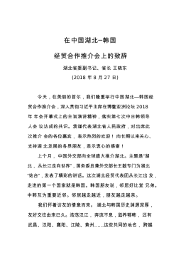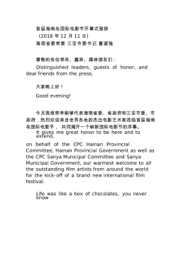 首届海南岛国际电影节开幕式致辞(2018年12月11日)海南省委常委三亚市委书记童道驰尊敬的各位领导、嘉宾、媒体朋友们:Distinguishedleaders,guestsofhonor,anddearfriendsfromthepress,大家晚上好!Goodevening!今天我很荣幸能够代表海南省委、省政府和三亚市委、市政府,热烈欢迎来自世界各地的杰出电影艺术家莅临首届海南岛国际电影节,共同揭开一个崭新国际电影节的序幕。Itgivesmegreathonortobehereandtoextend,onbehalfoftheCPCHainanProvincialCommittee,Hai...