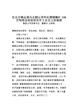 在北方铜业侯马北铜公司年处理铜精矿150万吨综合回收项目开工仪式上的致辞集团公司党委书记、董事长王树琪尊敬的各位领导、各位来宾、同志们、朋友们:大家上午好!临倚太岳立雄关,汾水之滨丰稻棉。今天,在这唐尧古都,平阳故地,我们隆重举行北方铜业股份有限公司侯马北铜铜业有限公司年处理铜精矿150万吨综合回收项目开工仪式,这是中条山集团的大喜事。在此,我谨代表中条山集团党政向各位领导、各位来宾的莅临表示热烈欢迎和衷心感谢!侯马北铜公司于1995年6月动工,1999年11月建成投产,由于种种原因,虽经数次改造,仍一直亏多盈少。中条山集团就此多方求证,破解侯马北铜经营发展困局,经过多年考察、调研、论证,根据...