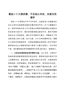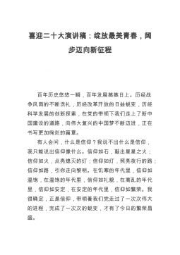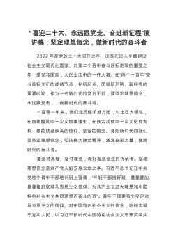 “喜迎二十大、永远跟党走、奋进新征程”演讲稿:坚定理想信念,做新时代的奋斗者2022年是党的二十大召开之年,这是在进入全面建设社会主义现代化国家、向第二个百年奋斗目标进军的重要之年,是党和国家,人民生活中的一件大事。在“两个一百年”奋斗目标交汇的战略节点,在新起点、面临新形势、新任务的重要时期,作为一名新时代的党员干部,要坚定理想信念,永远跟党走,,做新时代的奋斗者。一百零一年来,我们党历经千难万险,付出巨大牺牲,在血雨腥风中一次次绝境逢生,在跌宕起伏中一次次化危为机,靠的就是崇高的信仰、坚定的信念。身处新时代的我们要坚定理想信念,弘扬伟大建党精神,激发奋进力量,做新时代的奋斗者。要坚持真理、...