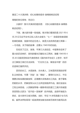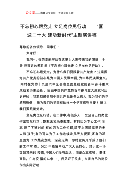 公文堂——海量公文资料,关注立即下载不忘初心跟党走立足岗位见行动——“喜迎二十大建功新时代”主题演讲稿尊敬的各位领导、同事们:大家好!我叫*,很荣幸能够站在这里为大家带来我的演讲,今天我演讲的题目是《不忘初心跟党走立足岗位见行动》。不忘初心跟党走。为什么我们要跟着共产党走?这是因为共产党员的初心是为中国人民谋幸福,为中华民族谋复兴。同时在党的十九届六中全会也全面总结党的百年奋斗重大成就和历史经验,回顾中国共产党的百年奋斗重大成就和历史经验,我深刻感受到中国共产党是多么伟大,我为我们的党感到骄傲,我为我们的祖国有这样一个党而感到自豪!所以我们要跟着党走。立足岗位见行动。在工作中,有很多人,立足自...