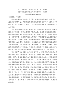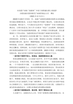 在高霍产业园“创新杯”年轻干部朗诵比赛上的致辞合肥高新区霍邱现代产业园管委会主任傅壮(2021年2月2日)2020年是极不寻常的一年,高霍产业园的发展既有始料未及的挑战,更有超出预期的惊喜,正是在不确定性中把握了确定性,让我们体会到征途漫漫,惟有奋斗。今天我们在这里举行“创新杯”年轻干部朗诵比赛活动,主要目的是为了深入学习合肥市“两会”会议精神,展现园区广大青年干部开拓创新的精神面貌,进一步增强工作的紧迫感、责任感使园区上下同心同向,为建设更高水平的高霍产业园区而共同努力。这一年,园区被列入全省首批18个长三角省际产业合作示范区。经济持续向好,经营收入、进出口总额、税收收入均实现三位数增长;基...