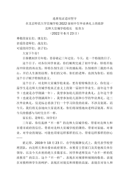 选择见证适应坚守在北京师范大学宣城学校2022届初中生毕业典礼上的致辞北师大宣城学校校长张育方(2022年6月23日)尊敬的家长们、朋友们,亲爱的老师们、战友们,可爱的同学们、孩子们:大家下午好!日晷镌刻岁月年轮,青春铭记三年过往。今天,是一个特别的日子。这个日子,对各位同学来说,你们顺利完成了初中学业,即将开始高中阶段的再出发;即将告别生活三年的励耘苑,告别相伴三载的半高山,开启人生新的征程。你们的父母、你们的老师,也因为你们,而给这个日子赋予特别的意义。这个日子,对北师大宣城学校来说,更有着特殊的含义,你们这一届学生是北师大宣城学校真正意义上的第一届初中毕业生。前年这个季节(也就是办学刚满...