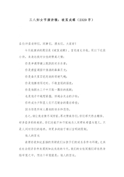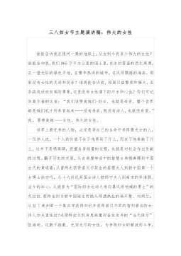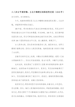 三八妇女节演讲稿:立志巾帼建功助推医院发展(1010字)各位领导,各位姊妹们:今天,我演讲的题目是《立志巾帼建功助推医院发展》,以此共勉,希望领导和朋友们指正。100年前,哥本哈根妇女代表会议的呐喊余音犹在,用民主和平等推动着全社会对于妇女的尊重;时光如梭,100年后,我们高举着先驱们的火把,用无可辩驳的成绩回应着历史的召唤。在我们即将迎来第100个国际劳动妇女节之际,我心潮澎湃,感慨万千。女人是伟大的,因为没有母亲就没有人类,就没有社会。世界文豪高尔基赞言道:没有女人便没有英雄。他的经典名着《母亲》传遍了全世界。沿着历史的印记向上追溯,巾帼女杰仿佛跃然眼前:遥想(已故女英雄的例子)。历史长河...