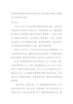 领导在庆祝建党100周年特别节目《红色地名故事》开播仪式上的致辞和讲话同志们:大家上午好!在党的百年华诞即将到来之际,在党史学习教育如火如荼深入开展之际,市民政局和xx广播电视台联合推出《庆祝建党100周年特别节目特辑——记住红色地名,赓续红色基因》,恰逢其时,很有意义。首先,我谨代表市政府,对节目的胜利开播,表示热烈祝贺!向为节目付出辛勤劳动的台前幕后工作者,致以诚挚问候!党的十八大以来,习近平总书记在地方考察调研时,多次到访革命纪念地,瞻仰革命历史纪念场所,反复强调要用好红色资源,传承好红色基因,把红色江山世世代代传下去。xx是一座有着光荣革命历史的城市,xx、xx等老一辈无产阶级革命家,...