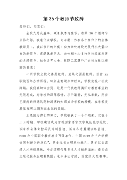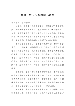 温泉开发区庆祝教师节致辞各位来宾,各位老师:大家好,伴随着时光款款的脚步,相携着岁月累累的果实,满载着流年盈盈的喜悦,我们相约在第29个教师节。首先,请允许我代表开发区教育办欢迎开发区和各村领导的到来,我们很荣幸地能与在座的各位来宾共同分享节日的快乐!谢谢你们,是你们的到来,温暖了我们的节日!教师节是平凡的节日,却有着辉煌的内涵;教师节是普通的日子,却有着五彩缤纷的色彩!“教师”二个大字的后面不仅有艰辛和付出,也有幸福和荣光。教育是人类最崇高的事业,人们常把教师比作蜡烛,比作春蚕,比作人梯,比作园丁。没有其他任何一种职业,能在人身上留下这么深刻的烙印;没有其他任何一种职业,能对人的灵魂产生这么...