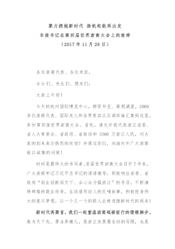 聚力拥抱新时代扬帆起航再出发车俊书记在第四届世界浙商大会上的致辞(2017年11月29日)各位浙商代表、各位来宾,女士们、先生们、朋友们:大家上午好!今天的杭州国际博览中心,群贤毕至、高朋满座。2000多位浙商代表、国际友人和各界贵宾从五湖四海汇集到这里,参加第四届世界浙商大会。首先,请允许我代表浙江省委、省人大常委会、省政府、省政协和5590万浙江人民,对大家的到来表示热烈的欢迎!并通过你们,向海内外广大浙商致以诚挚的问候!时间是最伟大的书写者。首届世界浙商大会召开7年来,广大浙商牢记习近平总书记的谆谆教导,积极响应省委、省政府“创业创新闯天下、合心合力强浙江”的号召,不断演绎辉煌的商业传奇...