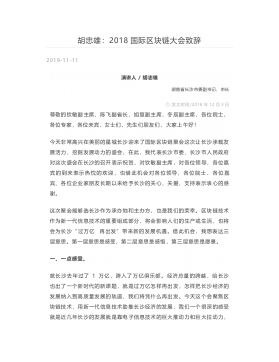 胡忠雄:2018国际区块链大会致辞20191111演讲人胡忠雄湖南省长沙市委副书记、市长发文时间2018年12月3日尊敬的钦敏副主席、陈飞副省长、旭复副主席冬辰副主席各位院士各位专家各位来宾女士们先生们朋友们大家上午好!今天非常高兴在美丽的星城长沙迎来了国际区块链聚会这次让长沙承载发展活力、挖掘发展动力的盛会在此我代表长沙市委、长沙市人民政府对这次盛会在长沙的召开表示祝贺对钦敏副主席对各位领导、各位嘉宾的到来表示热忱的欢迎也借此机会对各位领导、各位院士、各位嘉宾、各位企业家朋友长期以来给予长沙的关心、关爱、支持表示衷心的感谢。这次聚会能够选长沙作为承办地和主办方也是我们的荣幸。区块链技术作为新...