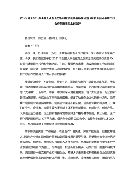 在XX市2021年全国大众创业万众创新活动周启动仪式暨XX职业技术学院市校合作专场活动上的致辞