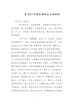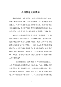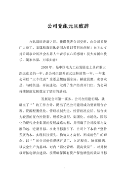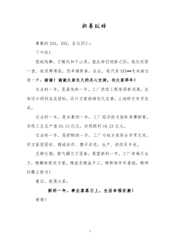 ·1新春致辞尊敬的XXX,XXX,各位同仁:下午好!银蛇起舞,日暖风和千山秀。值此辞旧迎新之际,我们欢聚一堂,叙深厚情谊,迎幸福新春。在此,我代表XXX**先向诸位道一声:谢谢!谢谢大家长久的关心支持,向大家拜年!Eýñ,º6ª¸eÒÜ,º6ª>¸oFV0AÍæF‹¸q‰AôA×N°_ÂF=¸AôA×ï~75#NLº¸Uf01Ú?ÅÂF>过去的一年,是自豪的一年。工厂经济技术指标再攀新高,实现工业总产值24.13亿元,实现税利10.23亿元。过去的一年,是舒畅的一年。工厂与地方政府合作更无间,双方紧密团结、精...