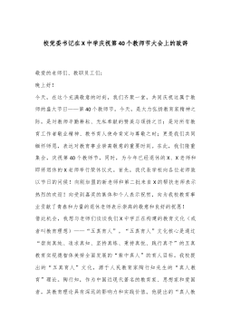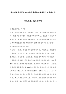 某中学党委书记在2024年秋季学期开学典礼上的致辞:昂首见前路,低头自耕耘亲爱的老师们、同学们:大家上午好!金秋时节,万物丰盈。今天,我们相聚在美丽的印山下,隆重举行X中2024年秋季学期开学典礼。值此第40个教师节到来之际,我谨代表学校向勤于耕耘、甘于奉献的全体教职员工致以最崇高的敬意和最真挚的祝福!向30名新老师和两千余名初一、高一新同学表示热烈的欢迎!过去的一个学期,通过全体师生的勤奋工作、共同努力,学校各项工作得到了进一步的发展,并取得了可喜的成绩:在党建、德育、教学教研、安全管理、后勤服务、新闻宣传等多方面工作均获得了上级的肯定和表彰;学校成功入选X省体育传统特色学校;在X县2024...