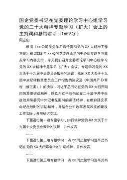国企党委书记在党委理论学习中心组学习二十大精神专题学习(扩大)会上的主持词和总结讲话