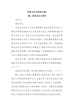 财务会议主持词(2篇)篇1:财务会议主持词同志们:现在开会。这次全厅财务工作会议是根据厅党组会要求召开的,主要任务是通报20XX年全厅财务收支状况,安排部署20XX年我厅财务工作。参加这次会议的有机关处室、财务集中管理单位的财务负责人和财务专管员、财务稽核管理单位的财务负责人和财务人员。会议议程主要有二项:一是请基金财务处处长张华艳同志通报我厅20XX年财务收支状况和20XX年财务管理工作的具体措施;二是请张瑞书厅长志讲话,对全厅20XX年财务工作进行全面安排部署。现在进行第一项议程,请张华艳同志向大家通报我厅20XX年财务收支状况和20XX年财务管理工作的具体措施。…………现在进行会议第二项...